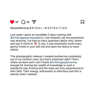 “Kristina and Kasia take great pride in their academy and investing in a 1-1 bridal makeup course with Kristina was genuinely the best thing I’ve ever done. I was blown away by the attention to detail and engagement they both gave me during my time there. Kasia worked hard on making the hair look absolutely gorgeous on the beautiful models they have at the academy, which I appreciated greatly. It meant I could get the absolute best content and create a bridal vision. So even though I wasn't taught by Kasia, I was amazed at how much she cared for my content and wanted me to get the best out of my 1-1. And Kristina… Genuinely the sweetest most knowledgeable person I’ve ever met. I came away with the most amazing tips and tricks and she has completely transformed my knowledge. I have already been applying this within my bridal consultations and work and the results are absolutely amazing. She demonstrated everything so clearly to me and motivated me throughout. She let me take the reins which I loved and guided me through the gorgeous looks. Pushing me outside my comfort zone with a ‘halo eye technique’ to ensure I came away with new skills. Not only did Kristina give me lots of makeup tips and tricks but she ensures that you gain a clear understanding of the theory behind bridal makeup. My mind was absolutely blown away with the knowledge on how to execute the most beautiful bridal looks. I couldn’t thank Kristina enough. Not only is she incredible but she looks after you so well. I had the absolute best day and it was such an incredible experience. Thank you Kristina for your time and Kasia for encouraging me and prepping my models' hair. The end looks were STUNNING!”- @rubyloubeauty