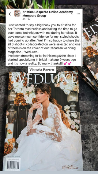 “I've been a makeup artist and hairstylist in Italy for 12 years and even after all this time I felt something was missing. I tried lots of courses with different academies but found myself more lost than before. Whilst scrolling through Insta I found the Kristina Gasperas Online Academy and was absolutely blown away. Sincerely, signing up was the best decision I ever made in my life! As a member for two years now I've been working hard on my makeup, hair and photography skills. I've built up my portfolio and my Insta account has grown in a way I can't believe! I was nominated by Wedding Vibes Magazine as one of the top 10 makeup artists in Italy and had my work is published in lots of other magazines. I am literally living the dream!”- LINDA
